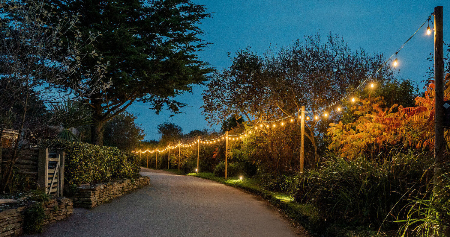 The bulbs are spaced 50cm apart and emit a warm white (2200K) glow. The energy efficient bulbs consume 90% less energy than traditional incandescent bulbs. They are dimmable with the use of an additional dimmer unit. Smart Features such as voice control or schedules is possible by purchasing our popular "smart socket" from our accessories section.